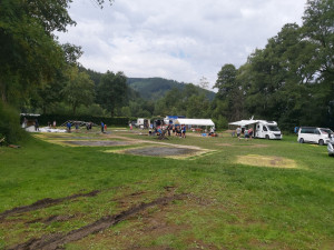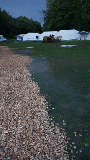 So oft wie in diesem Jahr haben wir diese Sätze wohl selten in einem Zeltlager sagen müssen. Und das bei einem Zeltlager, bei dem mit 51 Kindern (inklusive Betreuerkindern) so viele dabei waren, wie schon ewig nicht mehr. Schon beim Aufbau wurden die Helfer mehrfach pudelnass und der Wetterbericht versprach leider keine Besserung. Am Montag wurden noch vor der Ankunft der Kinder die ersten Anhänger Hackschnitzel geholt und zur Matschbekämpfung in den Küchenzelten und auf den Hauptwegen verteilt. Es sollten nicht die letzten bleiben, am Ende waren Wege und Zelteingänge abgestreut, Küchen- und Esszelt mit mehreren Schichten Hackschnitzel immer wieder trockengelegt und irgendwie war trotzdem alles schlammig.