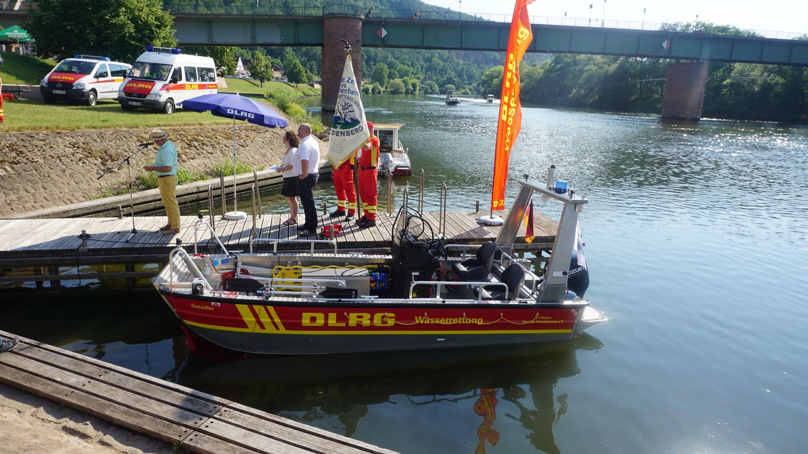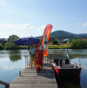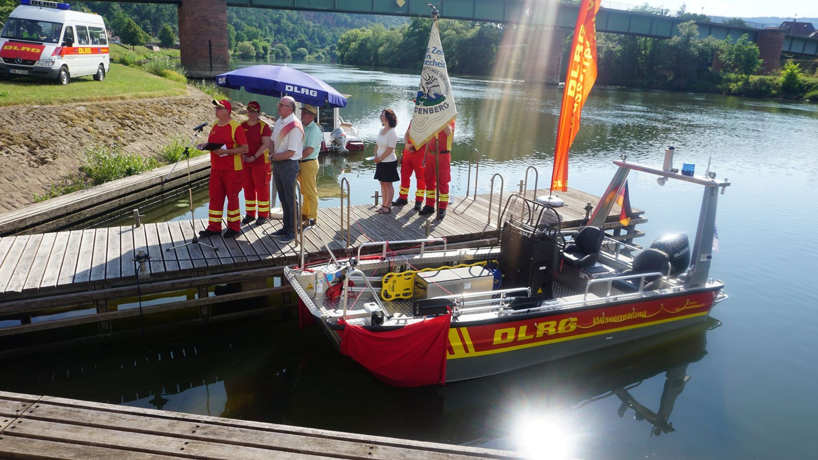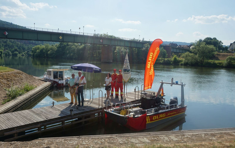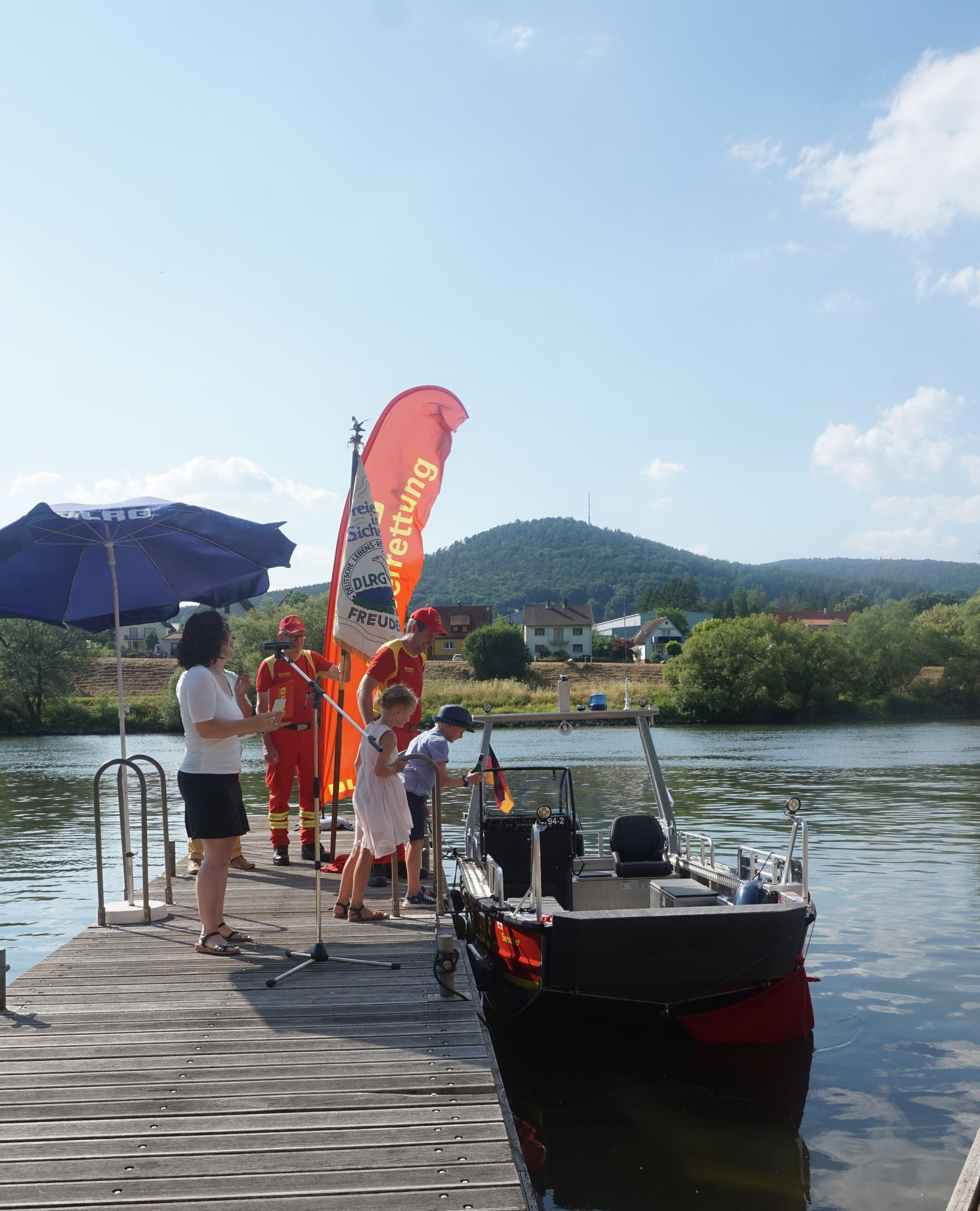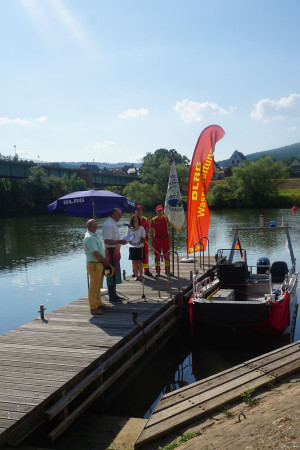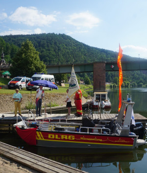 Im Vorfeld unseres Sommernachtsfestes mit Fackelschwimmen konnten wir unser lang ersehntes Motorrettungsboot segnen und taufen lassen. Die 1. Vorsitzende Sonja Büttner-Roth konnte bei bestem Wetter zahlreiche Gäste willkommen heißen. Darunter unseren Bürgermeister Roger Henning, Bezirksleiter Uwe Spielvogel, unsere Ehrenvorsitzenden Fred Hartmann, Peter Haamann und Harald Fuchs, sowie die Ehrenmitglieder Bodo Kapp und Norbert Oppelt nebst Gemahlinnen. Auch zahlreiche Feuerwehrler aus Freudenberg und Kirschfurt und DLRGler unserer benachbarten Ortsgruppen waren gekommen.