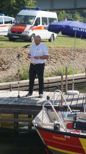 Diakon Michael Baumann überreichte als Gastgeschenk eine Plakette mit den Buchstaben IGN – in Gottes Namen. Diese wird einen Platz auf dem Boot finden und für den göttlichen Beistand auf allen Einsätzen sorgen. In einer kleinen Anekdote erzählte er, dass Helfer wie die Wasserrettungsdienste auch Gott gesandte Hilfe sind und lobte den Einsatz der DLRG für die Menschen. Anschließend segnete er das Boot. Die Nachwuchsretter Ida und Max Pölleth tauften es auf den Namen Seeadler, wünschten allzeit gute Fahrt und stets eine Handbreit Wasser unter dem Kiel. Sonja Büttner-Roth fügte noch den Wunsch an, dass alle Einsatzkräfte immer wieder gesund von ihren Einsätzen zurückkehren.