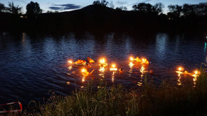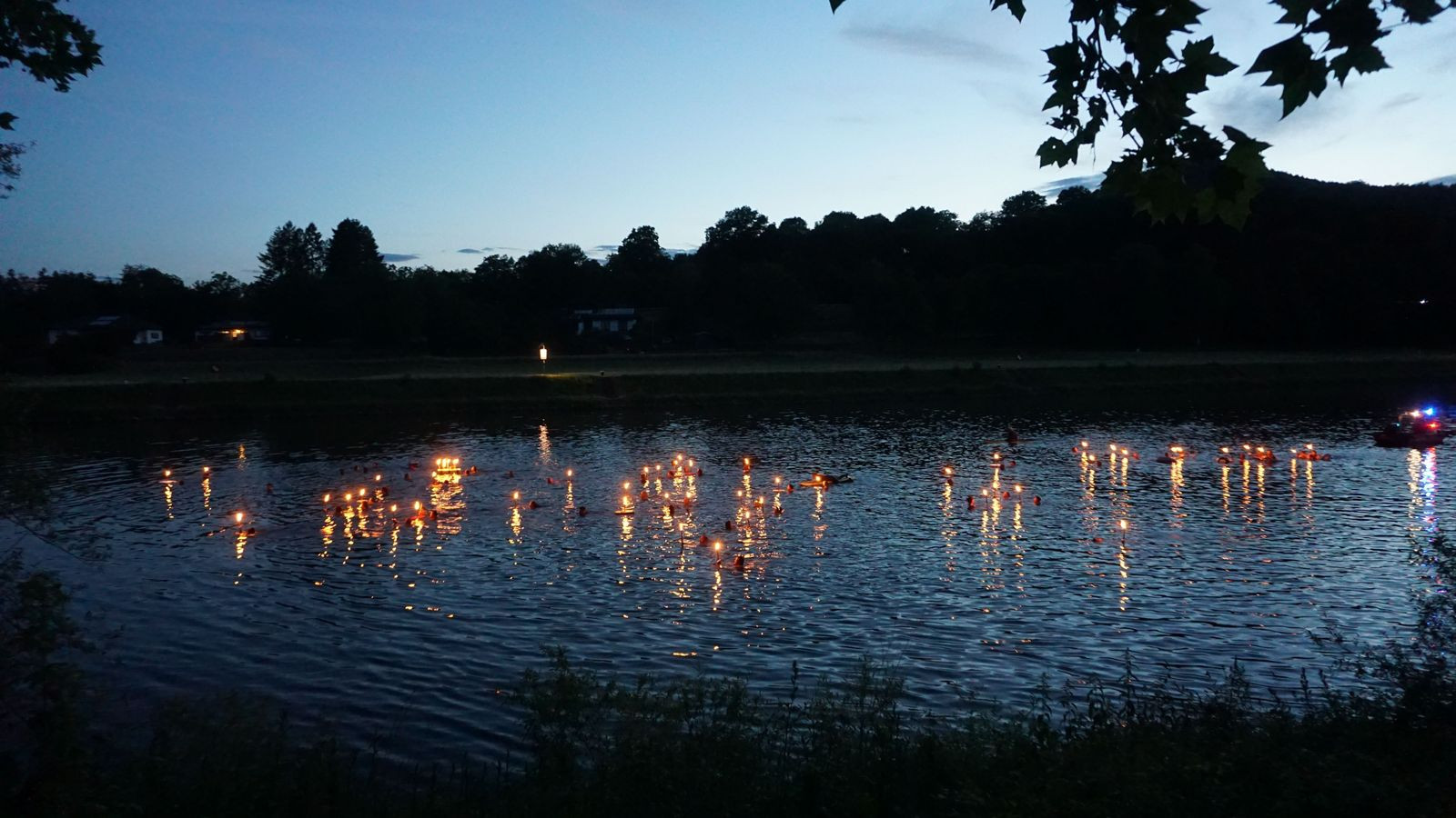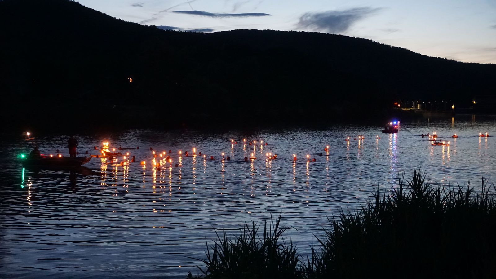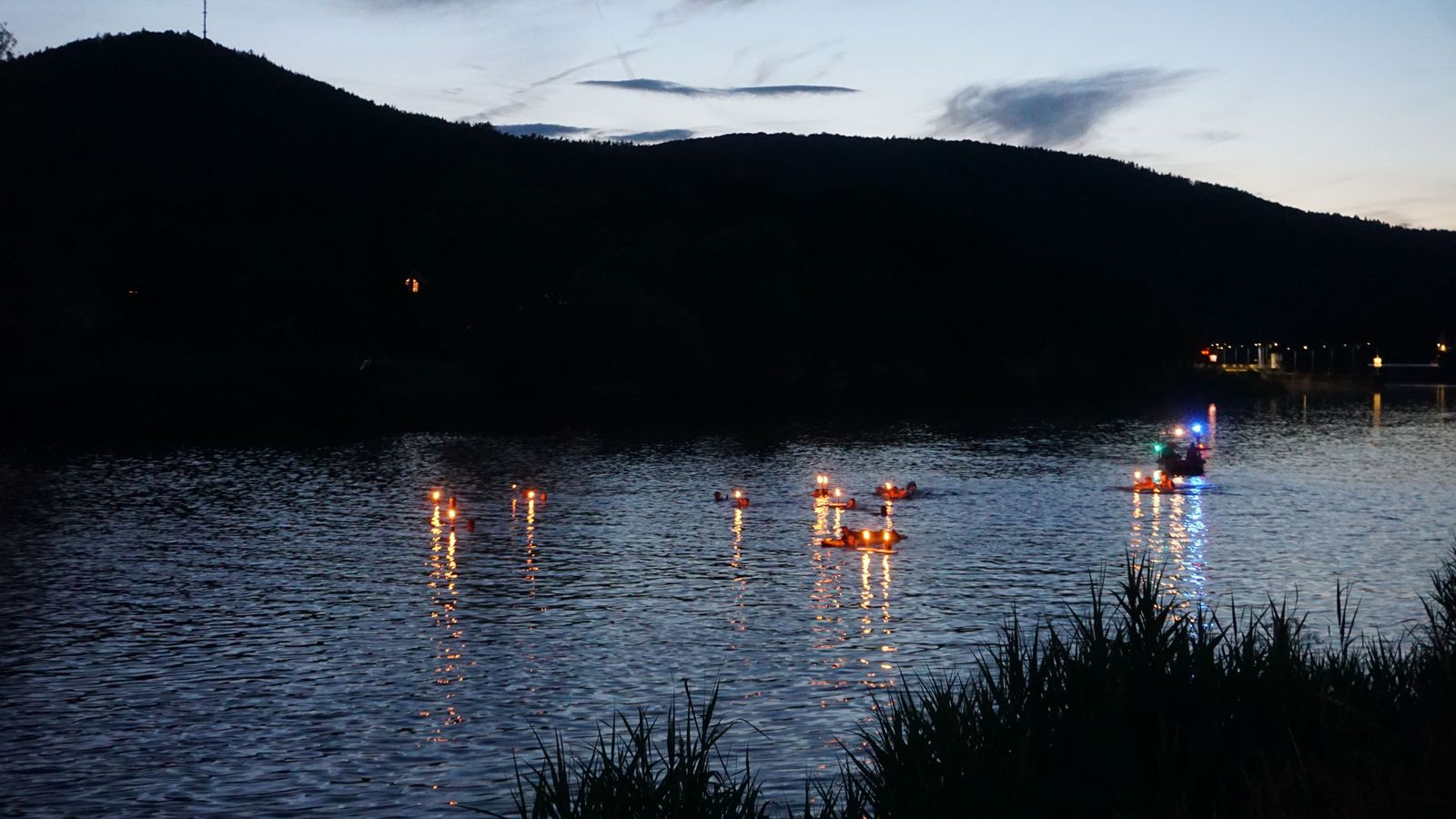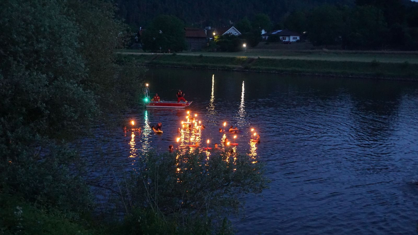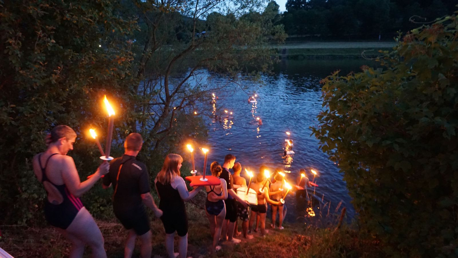 Um 21:30 Uhr machten sich insgesamt 59 Schwimmer aller Altersklassen auf den Weg zum Einstieg fürs Fackelschwimmen. Das Teilnehmerfeld war bunt gemischt – von der Familie mit drei Generationen bis zum Wohnmobilurlauber aus den Niederlanden. Manche sind zum ersten Mal mitgeschwommen, andere sind schon öfter oder sogar schon immer dabei. Nach der Ausgabe und dem Entzünden der Fackeln gab es die letzten Anweisungen und dann ging es auf Höhe des Schleusenspielplatzes ab ins Wasser. Angeführt wurde die Gruppe vom Boot der DLRG Höpfingen, die mit zwei Kameraden an Bord waren. Unter den Schwimmern befanden sich zwei Rettungsschwimmer auf Rettungsbrettern und den Abschluss machte unser Boot mit zwei Mann Besatzung und einem einsatzbereiten Taucher. An Land begleiteten vier Einsatztruppmitglieder die Schwimmer zu Fuß und standen in ständigem Kontakt per Funk mit den Booten. Die 1,1 Kilometer lange Strecke war gesäumt von begeisterten Zuschauern, die die Schwimmer anfeuerten und ihnen applaudierten. Nachdem alle Schwimmer wieder sicher an Land waren, wurden sie mit heißem Tee versorgt und, wer wollte, zum Duschen an den Badesee gefahren.