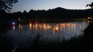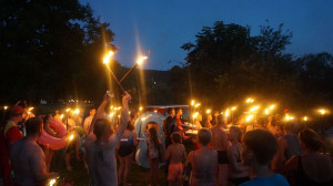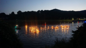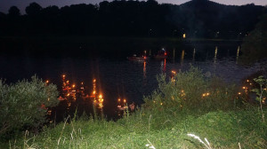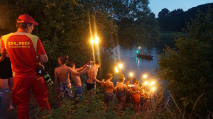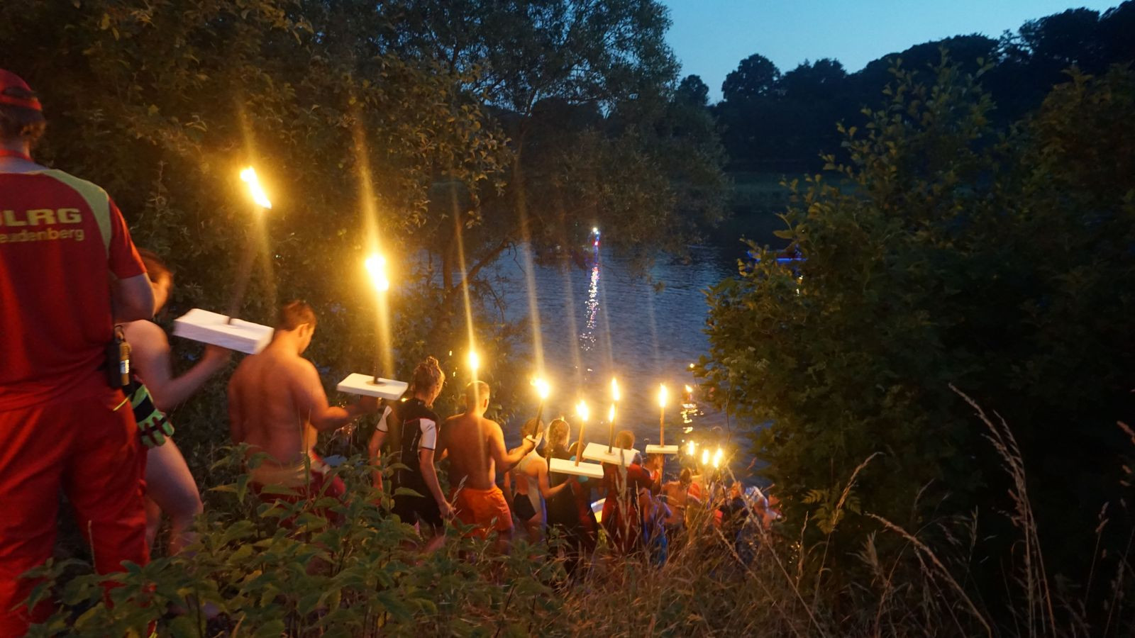 Um 21:45 Uhr machten sich insgesamt rekordverdächtige 86 Schwimmer aller Altersklassen auf den Weg zum Einstieg fürs Fackelschwimmen ca. 200 m unterhalb der Schleuse.